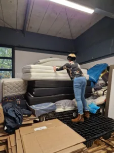 Ik begin een nieuwe pallet te stapelen. Dan druppelen er steeds meer mensen binnen. Gasten voor de shop voor nop die na een half uur tevreden naar buiten lopen met kleding en een stofzuiger, Hennie loopt even binnen om te kijken of alles goed gaat, Miranda komt met marktplaats spulletjes en rommelt wat. Samen zoeken we een sleutel die Ria ergens verstopt heeft.