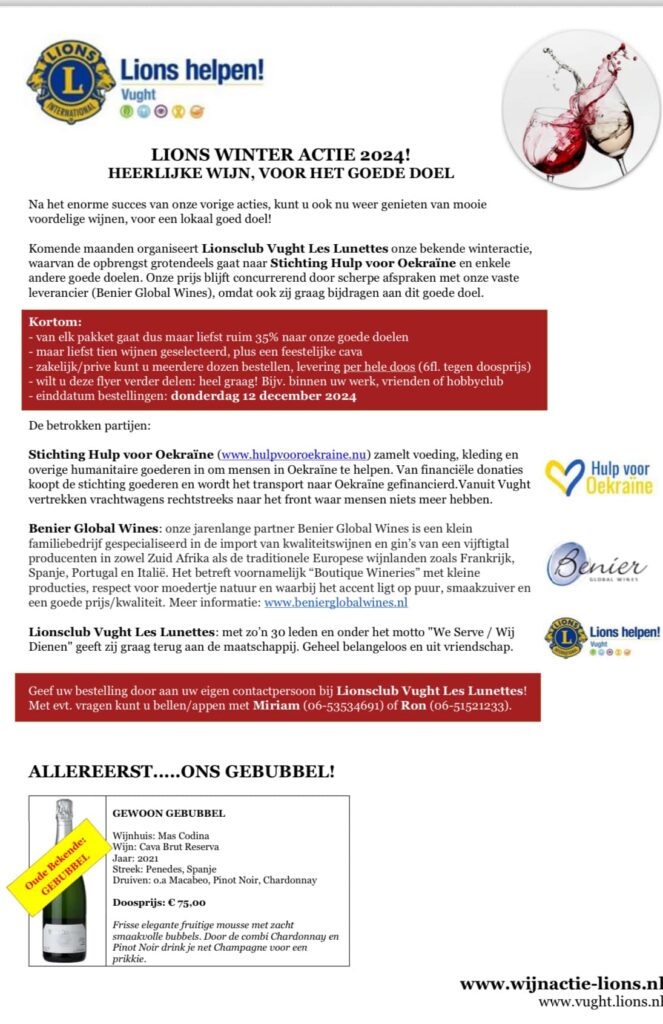 Goed nieuws! LionsClub Vught “les lunettes” heeft een eindejaarsactie waar tegen een scherpe prijs prachtige wijnen kunnen worden gekocht.